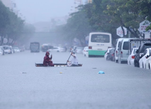 Người Đà Nẵng chèo thuyền trên phố sau trận mưa ngập lịch sử