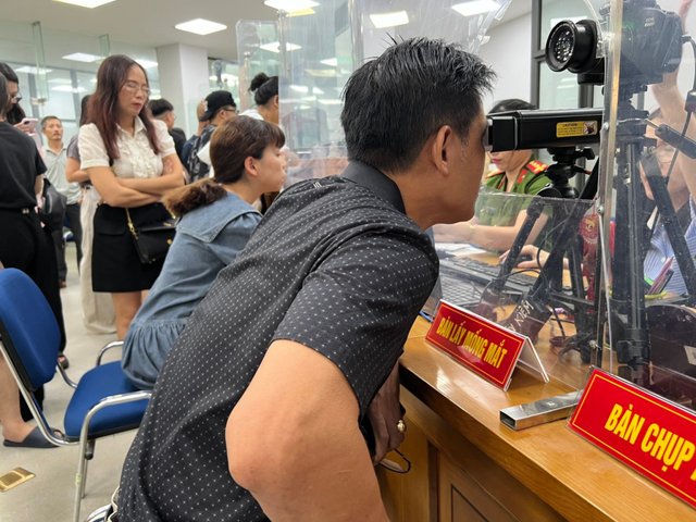 Nhiều trẻ em dưới 14 tuổi được cha mẹ đưa tới Phòng Cảnh sát Quản lý hành chính về Trật tự xã hội và công an các quận, huyện từ sớm để làm thủ tục cấp thẻ căn cước.