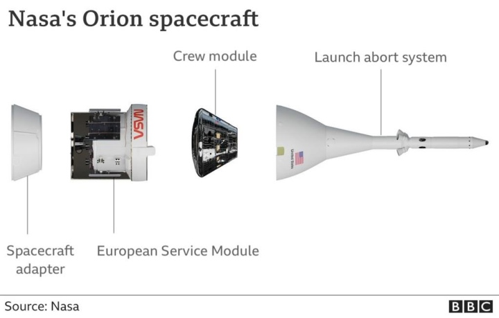 Nằm trên đỉnh tên lửa là tàu vũ trụ Orion mới của NASA được thiết lập để bay đến Mặt trăng và quay trở lại Trái Đất.