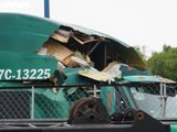 Cơn mưa gió vào chiều nay cũng khiến cần cẩu cao hơn 30m tại công trình cầu vượt Mỹ Thủy, hướng từ quận 7 sang thành phố Thủ Đức, đổ đè xe container và xe ô tô 7 chỗ đang đi song song cùng chiều. Rất may hai tài xế không bị thương, nhưng cả hai xe hư hỏng. Trong đó, xe container biến dạng phần đầu, một bên cabin bị khối thép đè lún.