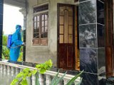 Lực lượng chức năng đang thực hiện phun thuốc khử khuẩn, xử lý môi trường xung quanh khu vực nhà các bệnh nhân nhiễm liên cầu lợn. (Ảnh: V.D)