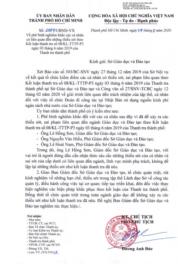 | Văn bản phê bình lãnh đạo Sở GDĐT TPHCM do Phó Chủ tịch UBND Dương Anh Đức kí. |
