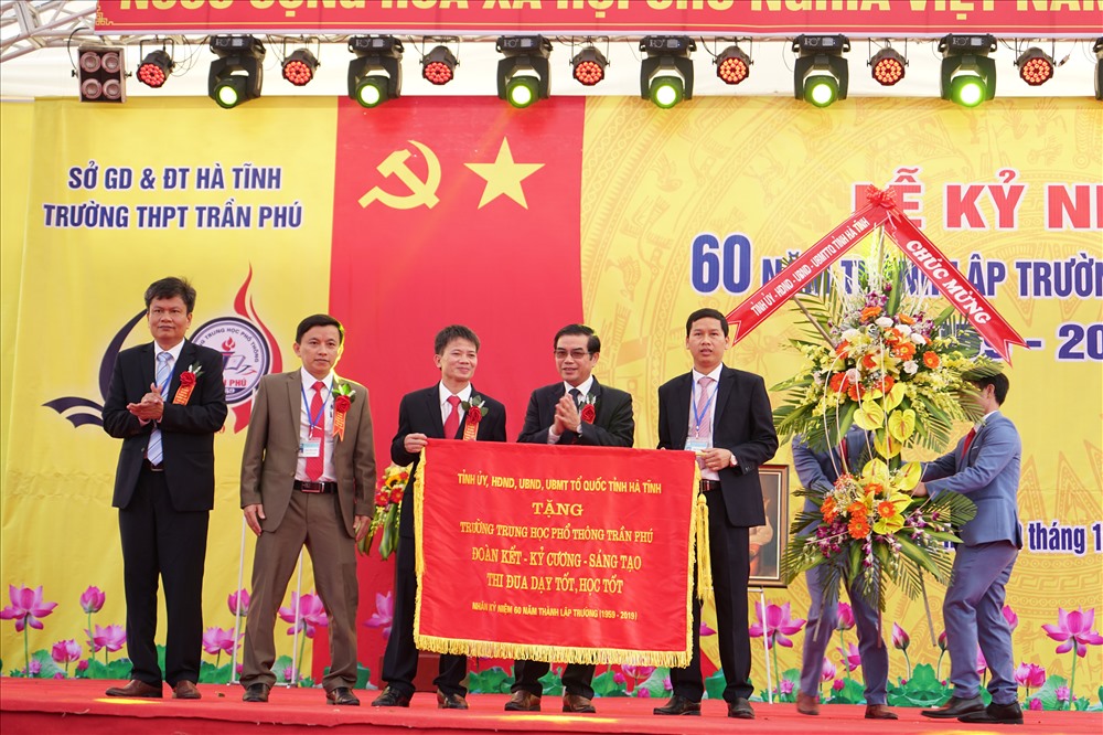 | Lãnh đạo tỉnh Hà Tĩnh tặng trướng cho trường THPT Trần Phú (Đức Thọ - Hà Tĩnh). Ảnh: QĐ |