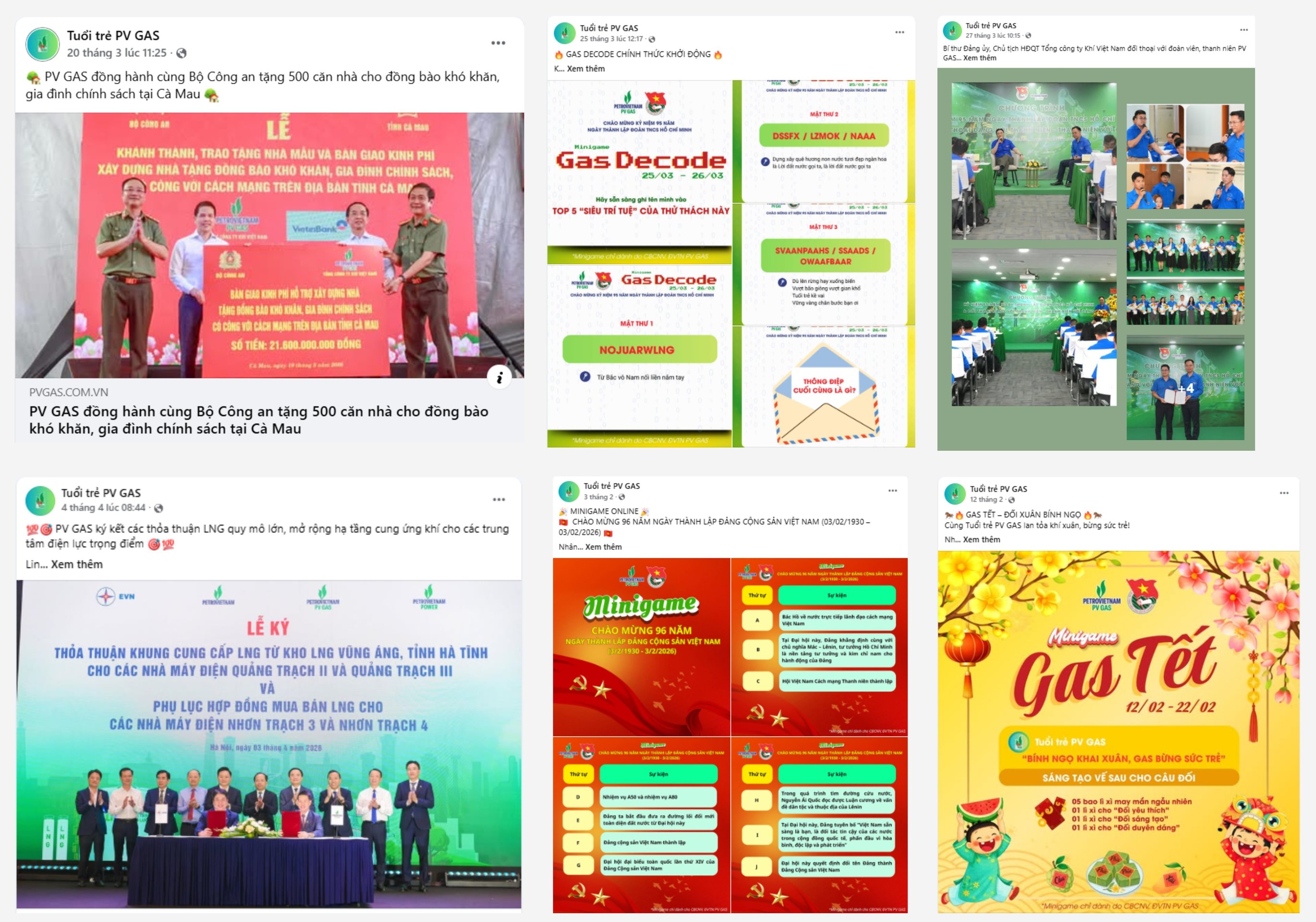 Song song đó, công tác truyền thông – giáo dục chính trị, tư tưởng tiếp tục được đổi mới theo hướng linh hoạt, phù hợp xu hướng số. Fanpage Tuổi trẻ PV GAS không chỉ triển khai các nội dung tương tác như minigame chào mừng Ngày thành lập Đảng, “Gas Tết”, “Gas Decode”, mà còn đóng vai trò là kênh tuyên truyền hiệu quả các chủ trương, chính sách các cấp, đồng thời cập nhật kịp thời tình hình hoạt động sản xuất kinh doanh của PV GAS. Qua đó, góp phần nâng cao nhận thức, tăng cường sự gắn kết và định hướng hành động cho ĐVTN trong toàn hệ thống.