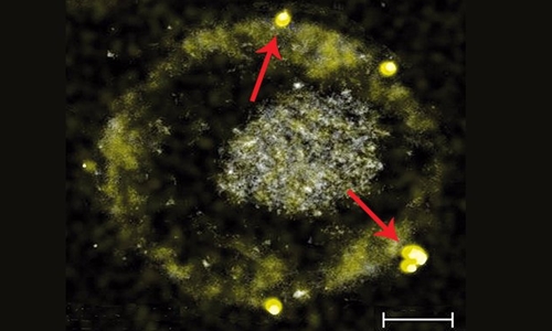| Các hạt vàng trên bề mặt vi khuẩn C. metallidurans. Ảnh: Hiệp hội Vi sinh học Mỹ. |