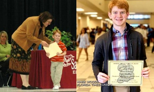 Năm 4 tuổi, Alex thay mặt chị gái đã mất nhận giấy khen đi học đầy đủ, sau đó âm thầm thực hiện lời hứa suốt 13 năm. Ảnh: CBS News