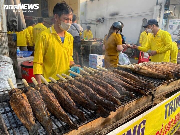 Mỗi dịp mùng 10 tháng Giêng, không khí tại các chợ dân sinh TP.HCM lại trở nên sôi động từ rất sớm. Tại các cửa hàng "cá lóc nướng mía lau” nổi tiếng, cá lóc với nhiều kích cỡ được làm sạch từ trước, xếp ngay ngắn trên các kệ sắt nhiều tầng. Khi các bếp than đồng loạt cháy rực, mùi thơm của cá nướng lan tỏa khắp góc phố, thu hút đông đảo người dân đến mua về cúng.