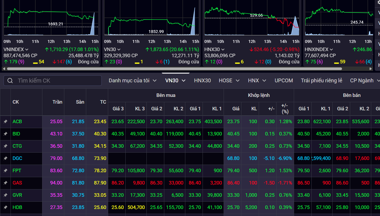 Sang phiên ngày 17-3, thị trường ghi nhận sự cải thiện rõ hơn: 179 mã tăng so với 147 mã giảm, thanh khoản lên 25.488 tỷ đồng, VN30-Index dẫn dắt với mức tăng 1,11% lên 1.873,65 điểm.