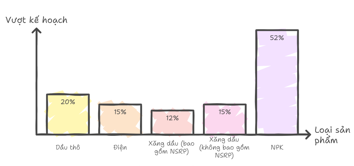 Lũy kế 9 tháng đầu năm 2025, hầu hết các chỉ tiêu sản xuất đều vượt từ 5-23%. Khai thác dầu thô đạt 7,37 triệu tấn, vượt 20% kế hoạch 9 tháng. Sản lượng điện đạt 23,92 tỷ kWh, tăng 15% so với cùng kỳ. Sản xuất xăng dầu đạt 12,3 triệu tấn (gồm NSRP), vượt 12% kế hoạch; nếu không bao gồm NSRP, sản lượng đạt 5,83 triệu tấn, vượt 15% kế hoạch, tăng 19% so với cùng kỳ 2024. Đạm urê duy trì sản lượng cao, đạt 1,4 triệu tấn. NPK bứt phá với mức tăng tới 52% so với cùng kỳ năm 2024.