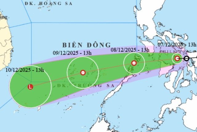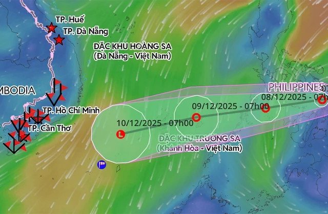 Dự báo, áp thấp nhiệt đới tiến gần Biển Đông rồi bất ngờ đổi hướng sang Tây Tây Nam, gây gió mạnh, biển động và ảnh hưởng đến khu vực Trường Sa từ ngày 8/12.