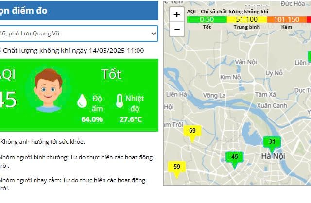 Ngày 14-5, chất lượng không khí trên địa bàn thành phố Hà Nội duy trì ở cấp độ 1 và 2, tương ứng ngưỡng tốt và trung bình, ít ảnh hưởng đến sức khỏe người dân.