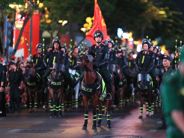 Màn trình diễn của đoàn Cảnh sát cơ động Kỵ binh vào tối 30/4 tại trung tâm TP.HCM thu hút nhiều sự chú ý từ người dân.