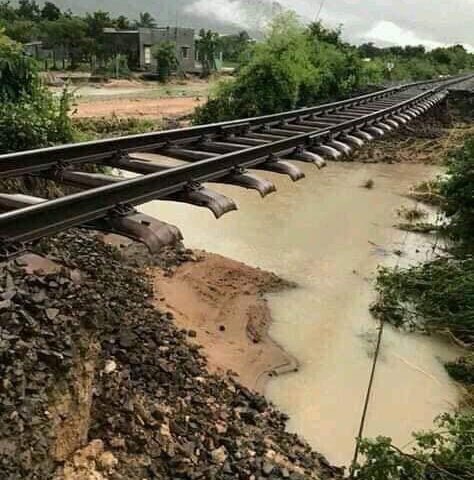 Hơn 300 m đường sắt Bắc - Nam, đoạn đi qua địa bàn xã Công Hải, H.Thuận Bắc Ninh Thuận, bị nước lũ tàn phá, giao thông đường sắt tê liệt.