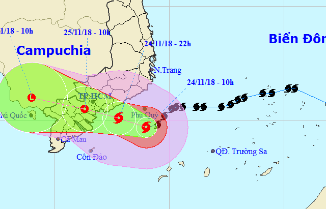 Dự báo khoảng 10 giờ đêm nay, 24.11, vùng tâm bão số 9 (bão Usagi) với gió mạnh cấp 9 - cấp 10, giật cấp 12 sẽ nằm trên vùng ven biển các tỉnh từ Bình Thuận đến Bến Tre.