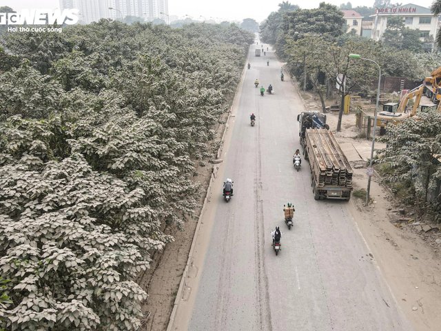 Tuyến đường gom Đại lộ Thăng Long (Hà Nội) nhiều ngày qua liên tục phủ bụi dày, cây cối ven đường trắng xóa như phủ lớp sương muối, khiến người đi đường ngộp thở.