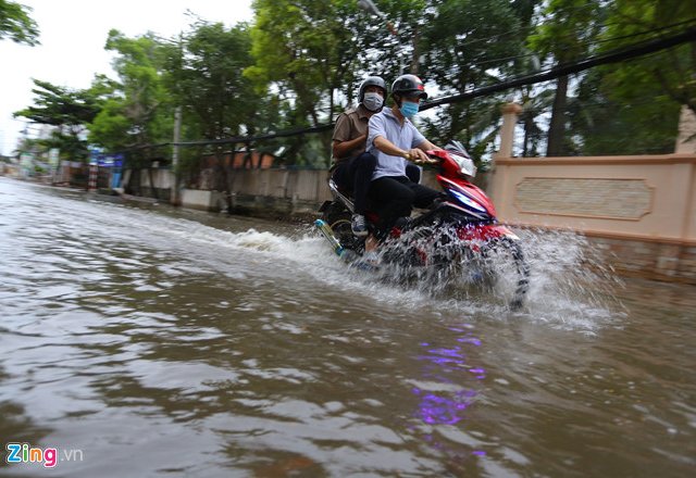 Triều cường lên cao đạt 1,61 m khiến nhiều tuyến đường thấp trũng gần kênh, rạch trên địa bàn TP.HCM bắt đầu ngập sâu, người dân đi lại khó khăn.