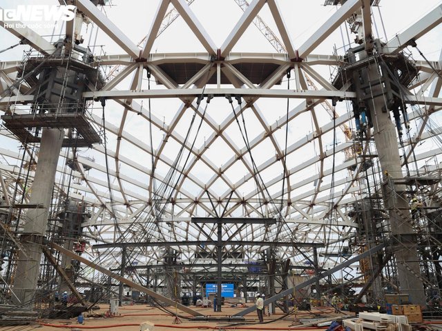 Mái thép nhà ga sân bay Long Thành, nặng hơn 5.300 tấn, được nâng thành công bằng hệ thống kích thủy lực, đánh dấu bước tiến quan trọng trong thi công dự án.