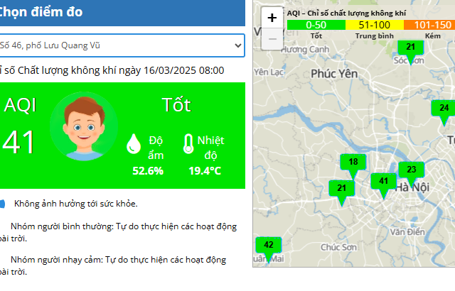 Sáng 16-3, không khí trên địa bàn thành phố Hà Nội trong lành, chỉ số quan trắc trên toàn thành phố ở mức tốt ( AQI dưới ngưỡng 50), không ảnh hưởng đến sức khỏe người dân.