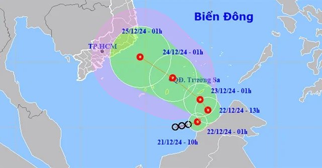 Áp thấp nhiệt đới hiện mạnh cấp 6 (39-49km/h), giật cấp 8, dự báo trong 48 giờ tới sẽ trên khu vực phía Nam quần đảo Trường Sa.