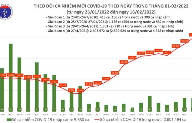 Chiều 16/2, Bộ Y tế công bố thêm 34.737 ca COVID-19, trong đó 34.723 ca ghi nhận trong nước.
