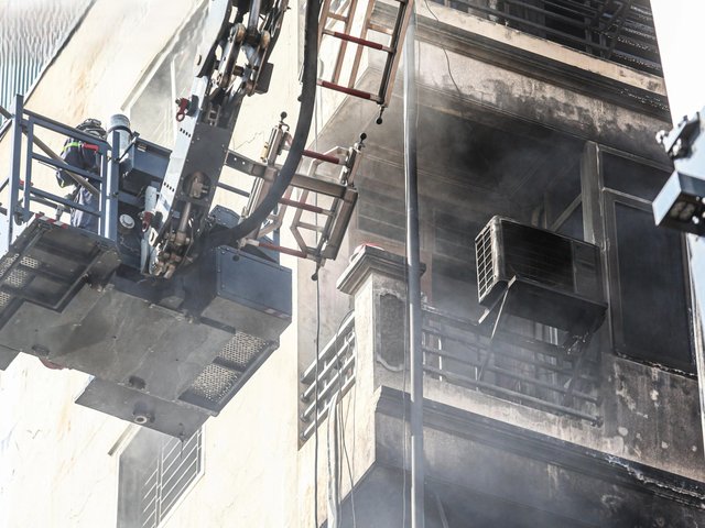 Sau vụ hỏa hoạn, căn nhà 7 tầng trên phố Lê Lợi (Hà Nội) chỉ còn lại khung, các tầng phủ kín muội khói, nhiều đồ đạc đổ sập, không gian nồng nặc mùi khét.