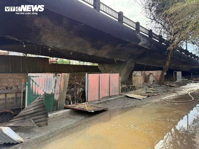 Đám cháy thiêu rụi hàng trăm xe máy, sức nóng làm bong tróc từng mảng bê tông dưới chân cầu Vĩnh Tuy, dầm cầu cũng bị khói ám đen.