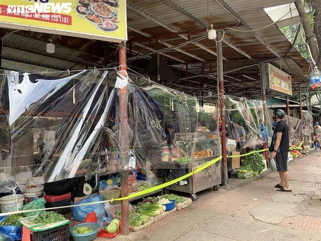 Hầu hết tiểu thương tại nhiều chợ ở Hà Nội đều tự lắp vách ngăn, căng dây giãn cách, khách mua cũng không được đứng gần lựa chọn, phải sát khuẩn khi trả tiền.