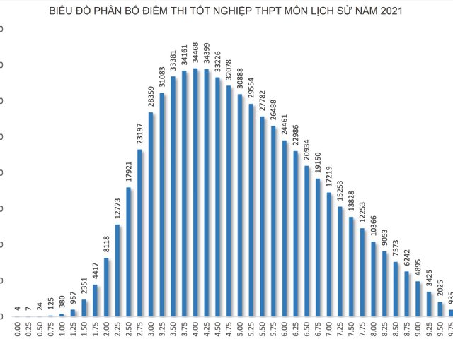 Trong kỳ thi tốt nghiệp THPT 2021, 226 thí sinh đạt điểm 10 môn Lịch sử và 331.429 em điểm dưới trung bình, điểm trung vị là 4,75 điểm số có nhiều thí sinh đạt nhất là 4