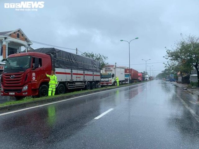 Do ảnh hưởng của bão số 9, khiến xe tắc trên quốc lộ 1A đoạn qua huyện Phú Lộc (Huế) dài hơn 3km từ đêm qua và CSGT mang cơm phát miễn phí cho tài xế.