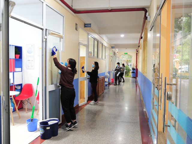 Sáng nay 3/2, các học sinh ở Hà Nội đã được nghỉ học theo thông báo chung để phòng tránh virus corona. Tuy nhiên, các giáo viên vẫn túc trực, tiếp tục dọn vệ sinh trường lớp.