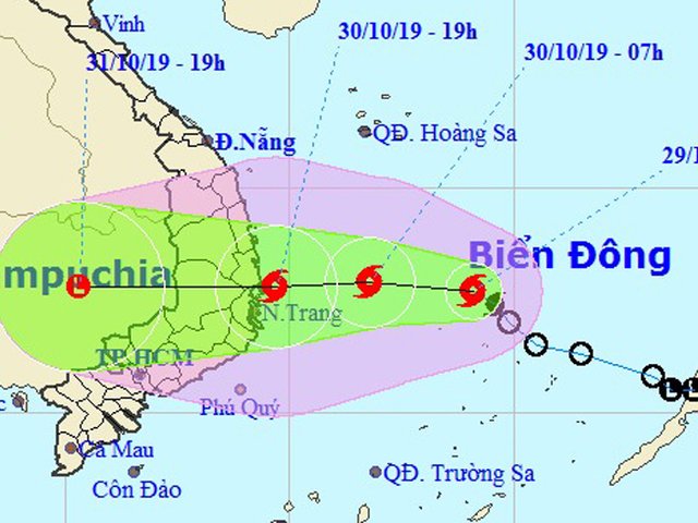 Chiều tối 29/10, áp thấp nhiệt đới đã mạnh thành cơn bão thứ 5 ở biển Đông với sức gió tối đa 75 km/h (cấp 8), hướng vào các tỉnh Bình Định - Phú Yên.