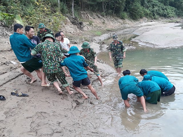 Lực lượng chức năng trục vớt quả bom nặng 343 kg tại sông Nậm Mộ, huyện biên giới Kỳ Sơn sáng 25/10.