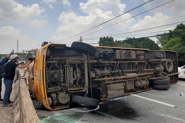 Xe khách chở hàng chục người chạy trên quốc lộ 13 qua tỉnh Bình Dương thì bị văng bánh ra ngoài, lật ngang khiến nhiều người bị thương.