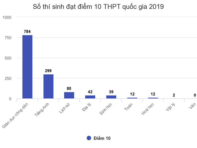 Môn Giáo dục công dân có 784 em đạt điểm 10, môn Vật lý chỉ 2 em, trong khi môn Ngữ văn không ai đạt điểm tuyệt đối.