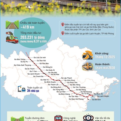 Theo Nghị quyết 187/2025/QH15 của Quốc hội, dự án đường sắt Lào Cai - Hà Nội - Hải Phòng dài khoảng 419km với tổng vốn 203.231 tỷ đồng (tương đương 8,37 tỷ USD), khởi công trong tháng 12-2025 và phấn đấu hoàn thành chậm nhất năm 2030.