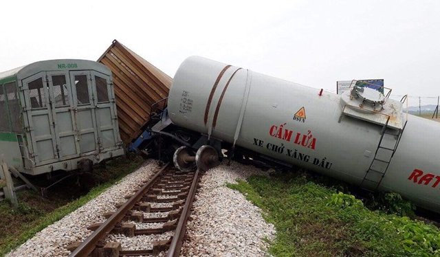 Cú va chạm với xe tải khiến 4 toa tàu hàng bị lật, trong đó 1 toa chắn ngang đường quốc lộ, 2 toa lao xuống ruộng khiến giao thông bị ách tắc nghiêm trọng.