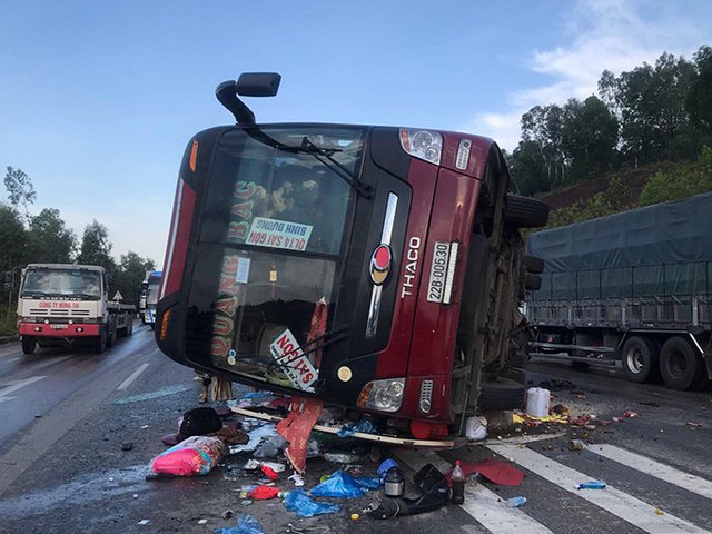 Tránh người bị tai nạn, ôtô khách lật nghiêng bên quốc lộ