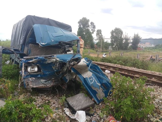 Xe tải va chạm tàu hỏa, tài xế và phụ xe nguy kịch