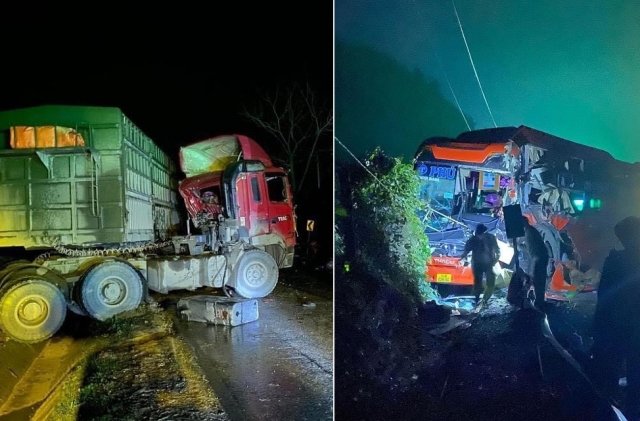 Xe đầu kéo đấu đầu xe khách trên quốc lộ 2 khiến tài xế xe khách chết tại chỗ, 6 người khác bị thương.
