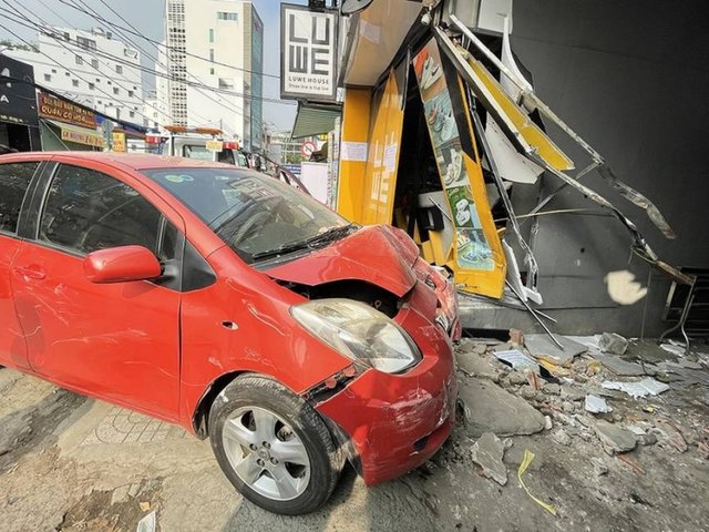 Sau khi tông 2 xe gắn máy chạy theo chiều ngược lại, chiếc xe 4 chỗ do người phụ nữ điều khiển đã tông vào tiệm giày rồi lao vào tiệm kính mới dừng lại…