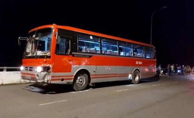 Ôtô khách đang lưu thông trên quốc lộ 1 thì bất ngờ tông vào biển báo giao thông, sau đó lao vào dải phân cách trên cầu Bến Chùa đoạn qua TP Mỹ Tho, tỉnh Tiền Giang.