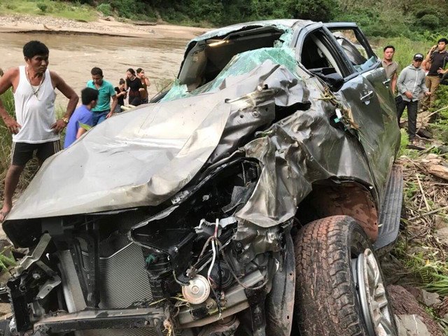 Chiếc xe bán tải mất lái lao xuống vực gần bờ sông khiến 3 thầy cô giáo thương vong.