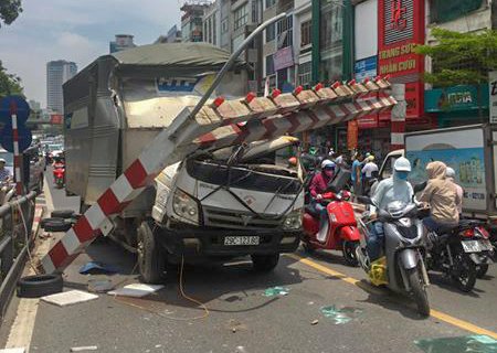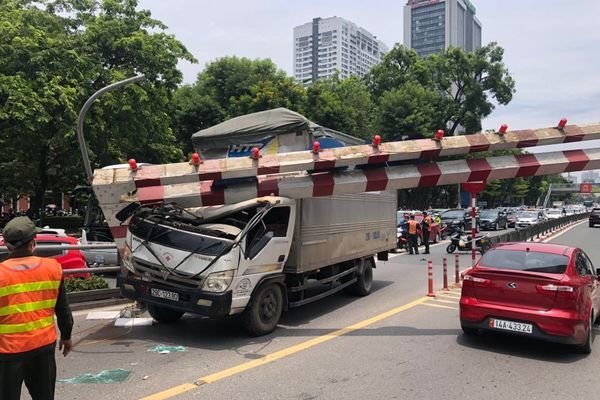 Ô tô tải "hạ gục" thanh chắn cầu vượt Thái Hà- Tây Sơn