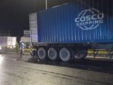 Tại hiện trường, xe đầu kéo lật nghiêng, chắn ngang mặt đường khiến giao thông ùn tắc cục bộ trong nhiều giờ.