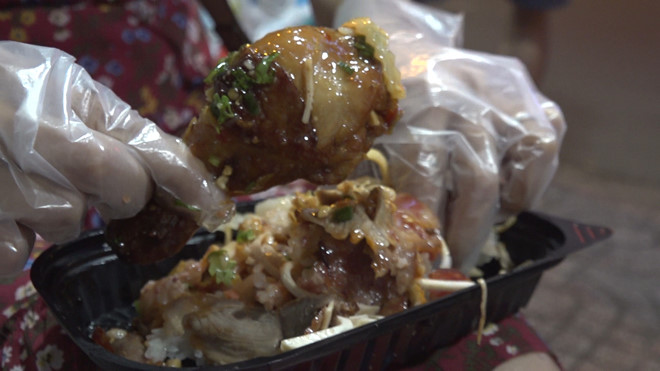Anh Phạm Minh Hiển, chủ xe xôi đêm "bật mí" cách thưởng thức - đó là đưa cho mỗi khách hàng một cặp bao tay để cầm đùi gà ăn hay bốc xôi chấm nước sốt. Xe xôi mở bán từ 7 giờ tối đến khuya.