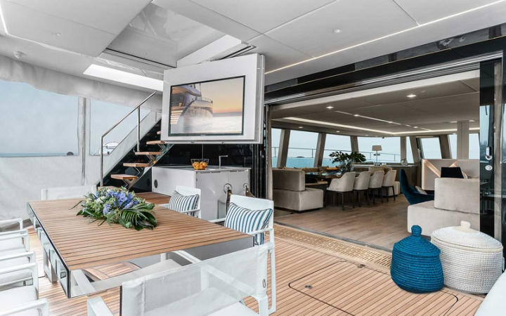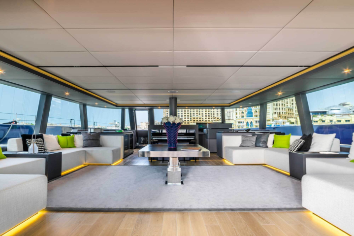 Một chiếc siêu du thuyền chắc chắn không thể thiếu không gian sang trọng và những tiện nghi xa xỉ không thua một biệt thự di động trên biển. Không gian sống rộng lớn rộng 535m2 có thể được tùy chỉnh để bao gồm phòng khách, nơi nghỉ chân cho khoảng 10 khách và các thành viên phi hành đoàn, spa, thư viện hoặc phòng tập thể dục. Cabin chính có khu vực hiên ngoài trời, trong khi tầng bên dưới có hồ bơi ngoài trời, quầy bar và khu vực ăn uống.